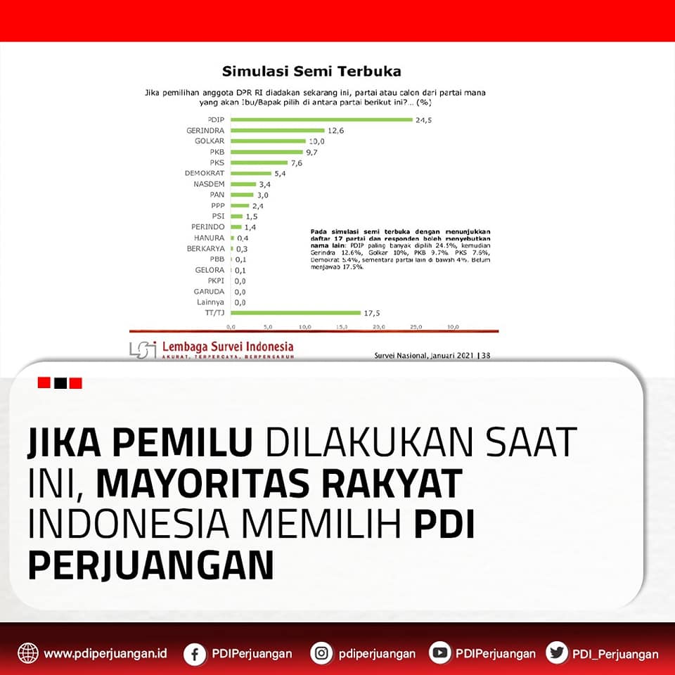 Empat lembaga survei yang merilis data pada Februari 2021 menyatakan Partai Demokrasi Indonesia Perjuangan (PDIP) menjadi partai yang berada pada posisi teratas dengan elektabilitas di atas perolehan Pemilu 2019. Hasil Survei tersebut juga menyajikan data bahwa PDIP merupakan partai yang paling dekat dengan rakyat, jauh dibanding partai-partai lain.