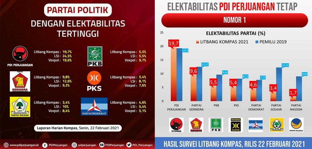 Sebagai partai pemenang pemilu, Partai Demokrasi Indonesia Perjuangan (PDIP) masih memiliki elektabilitas tertinggi. Hasil survei terbaru menunjukkan, tingkat keterpilihan PDIP 19,7 persen. Adapun tingkat kepercayaan survei tersebut 95 persen dan margin of error +/- 2,83. Angka ini lebih rendah jika dibandingkan dengan dua survei terdahulu, yakni pada Oktober 2019 (21,8 persen) dan Agustus 2020 (23,1 persen).