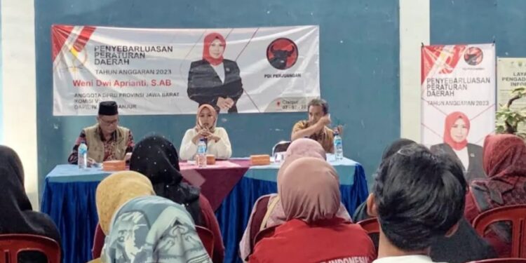Anggota Komisi V DPRD Jabar, Weni Dwi Aprianti, S.Ab, melaksanakan sosialisasi penyebarluasan Perda nomor 15 Tahun 20217 tentang Pengembangan Ekonomi Kreatif, di desa Sukawargi, Kecamatan Warung Kondang, Kabupaten Cianjur, Jumat 7 Juli 2023.