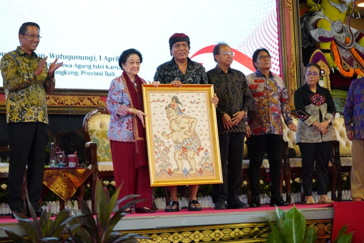Ketua Dewan Pengarah Badan Riset dan Inovasi Nasional (BRIN) Megawati Soekarnoputri dan Menteri Hukum Supratman Andi Agtas menyerahkan sertifikat Hak Kekayaan Intelektual (HKI) ke seratusan penerima di Bali yang didominasi seniman.