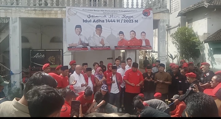 Bertempat di Sekretariat Dewan Pimpinan Cabang (DPC) Partai Demokrasi Indonesia (PDI Perjuangan), Jalan Merdeka, Kecamatan Tarogong Kidul, Kabupaten Garut tengah diadakan penyembelihan dua ekor sapi sebagai hewan qurban dengan bobot 850 kg di hari Raya Idul Adha 1444 Hijriyah, Kamis (29/6/2023).