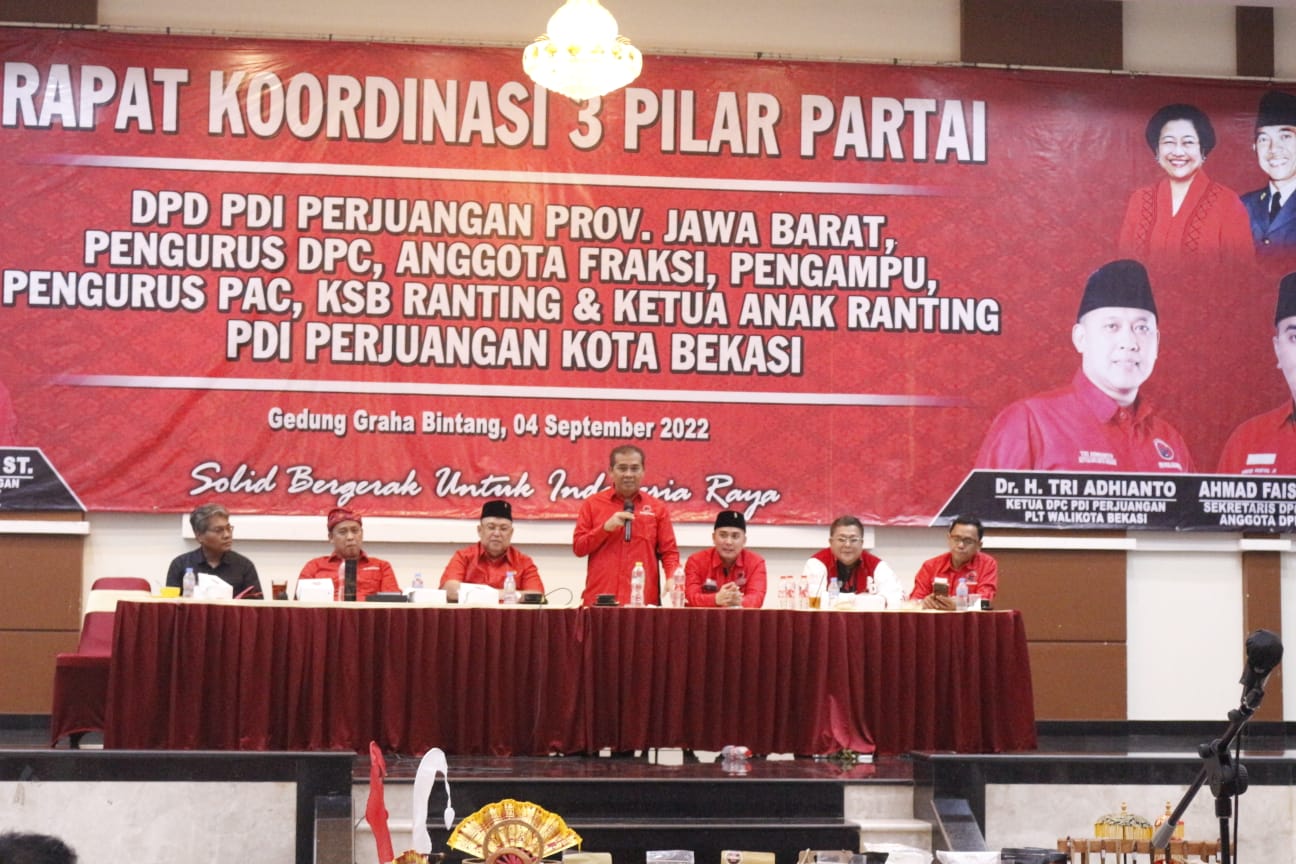 Kota Bekasi – DPC PDI Perjuangan Kota Bekasi gelar Rapat Koordinas Tiga Partai yang diikuti oleh Pengurus DPC, Anggota Fraksi, PAC, Ranting dan Anak Ranting di Gedung Graha Bintang (04/09/2022).